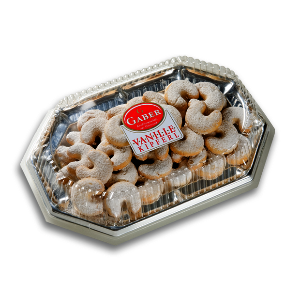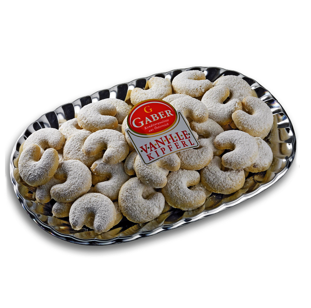 Sehr wohl schmeckendes Vanillekipferl (mit Butter und vielen gehackten und gerösteten Haselnüssen) – bestreut mit feinem Staubzucker. Gut geschützt und lange frisch dank der neuen transportsicheren Aromaschutzverpackung.